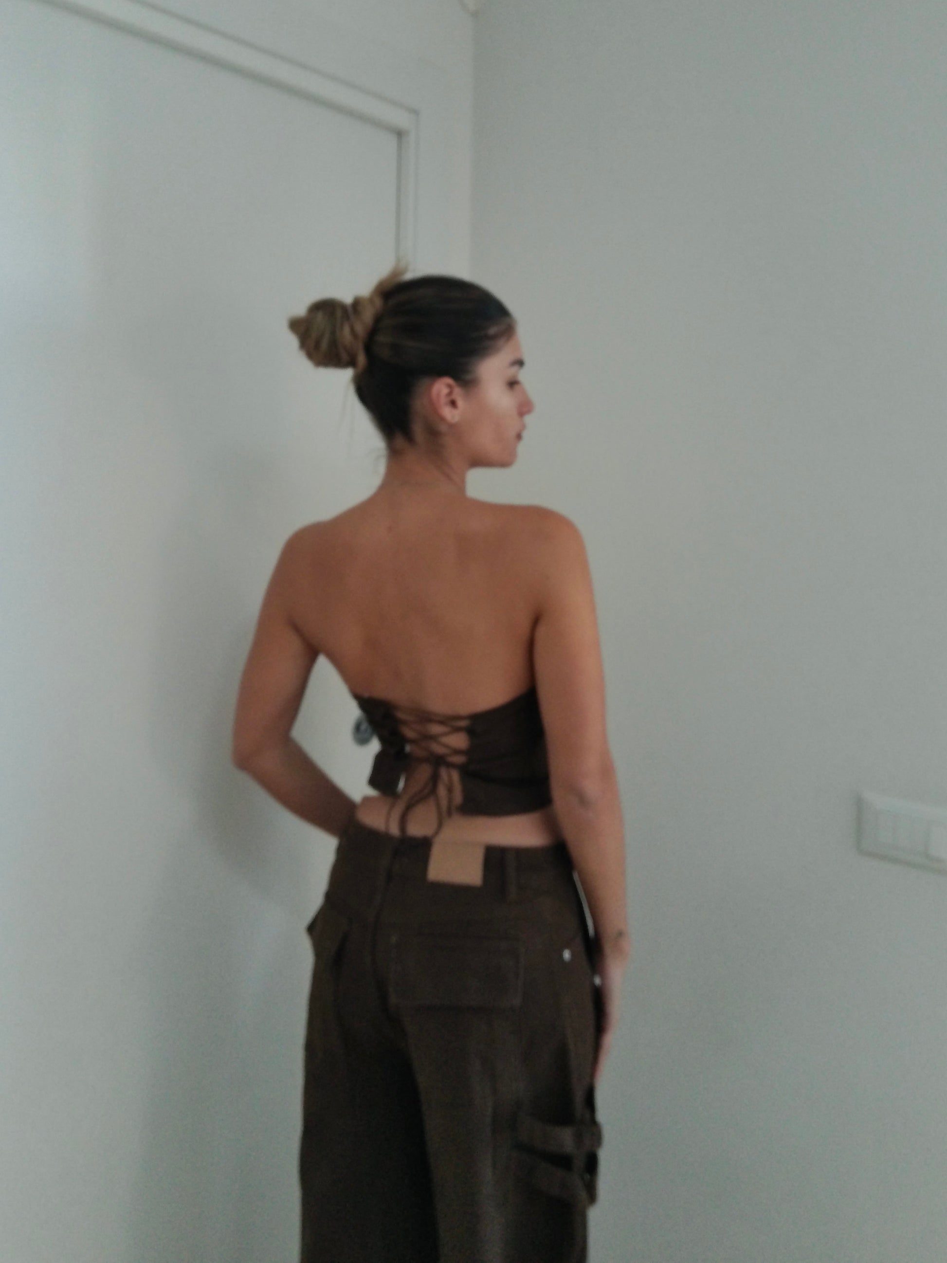 Corpetto in simil camoscio con coppa preformata e dettagli sul davanti e sul retro.