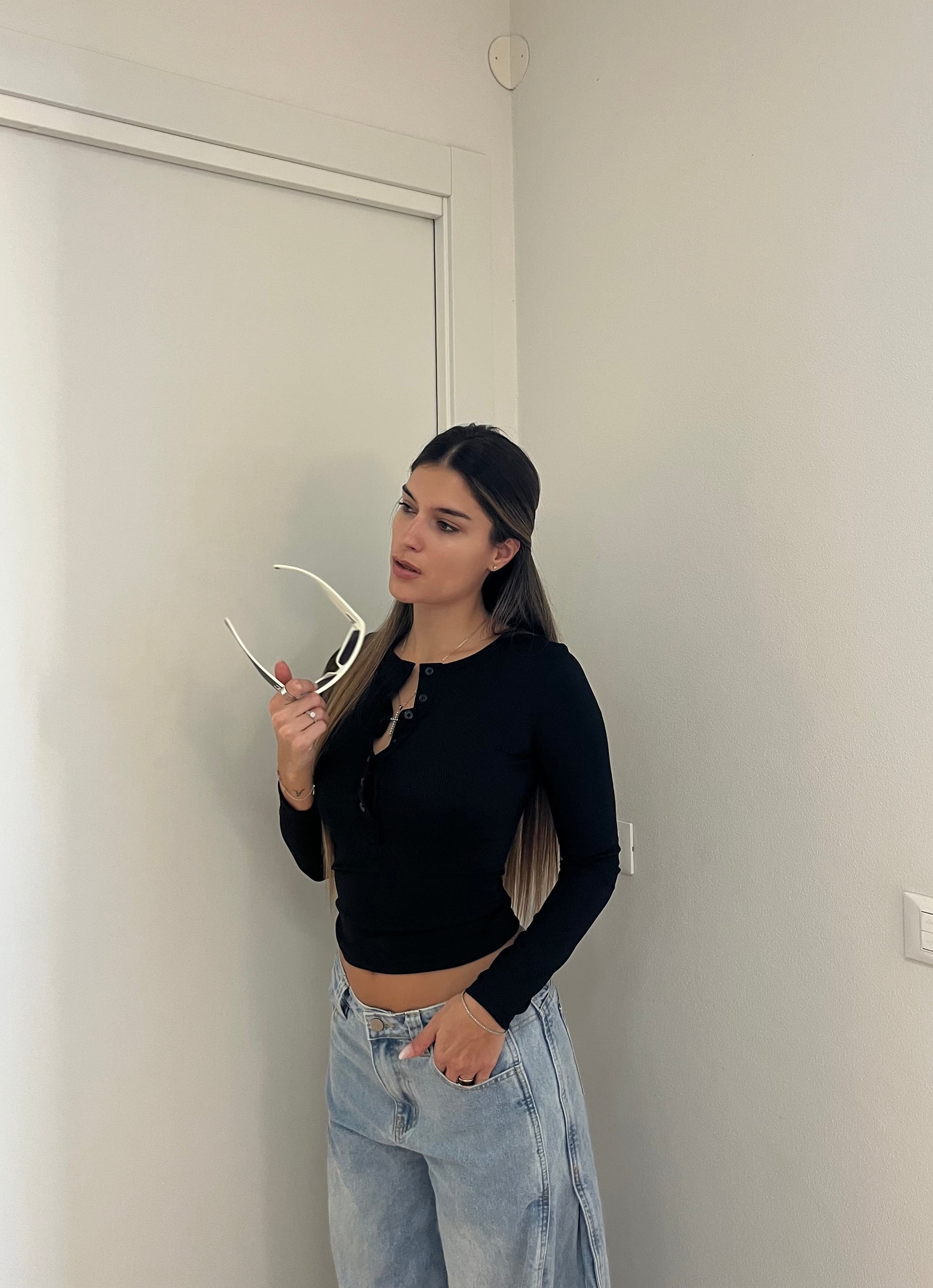 Maglia a costine con bottoncini sul davanti in tessuto elasticizzato.