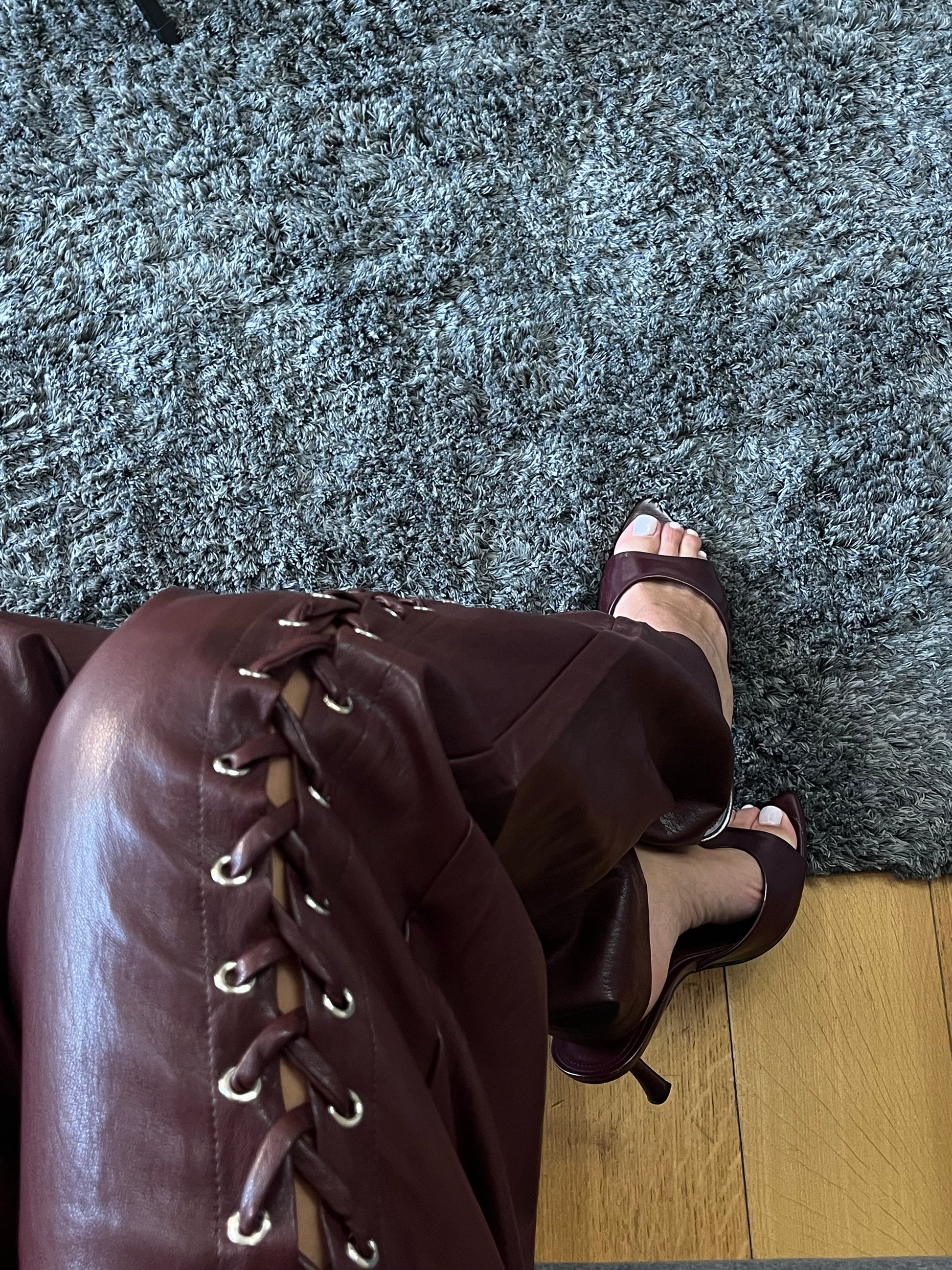 Pantalone in ecopelle bordeaux con dettaglio sul davanti.