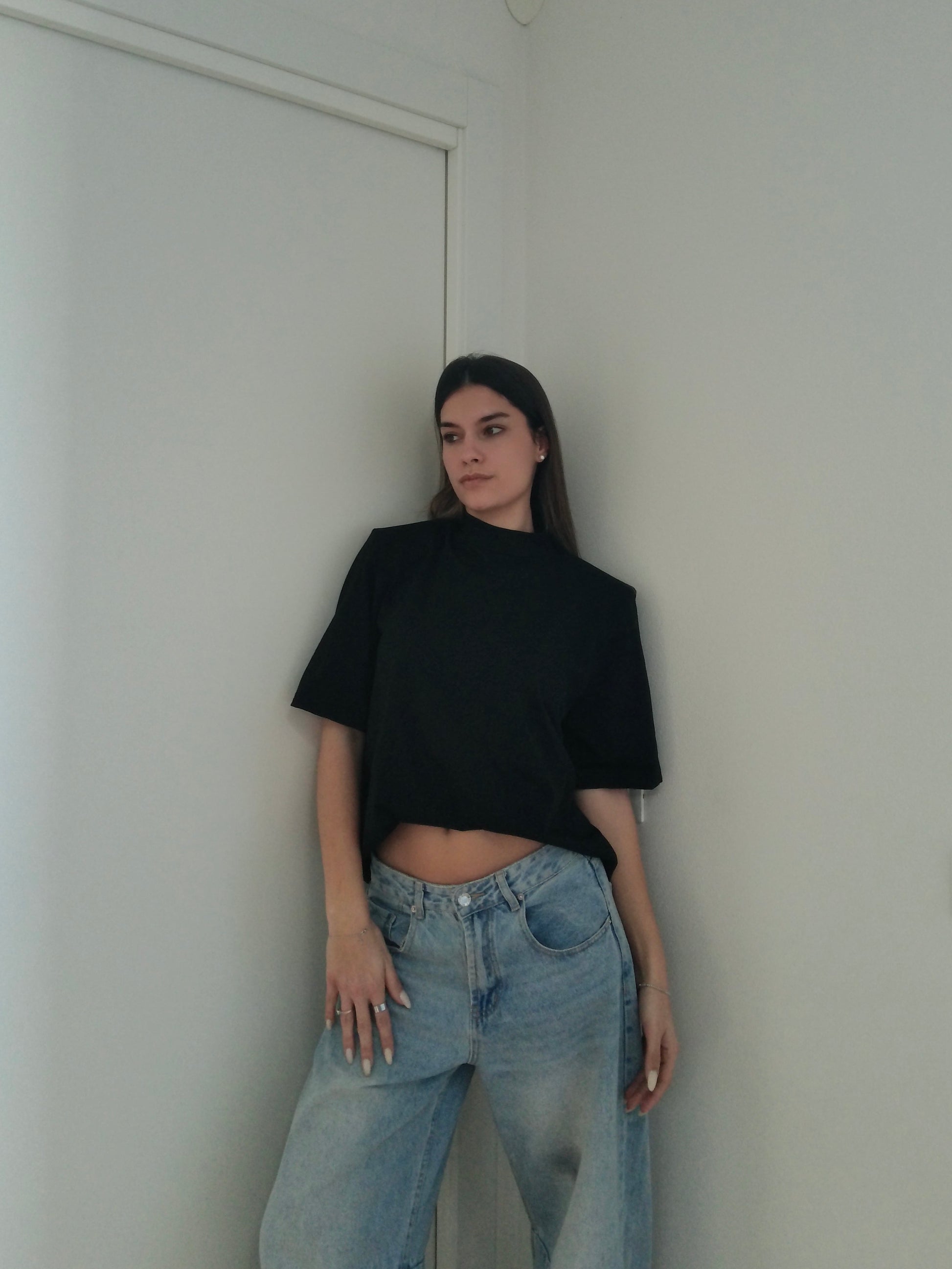 T-shirt over con spalline imbottite e colletto alto.